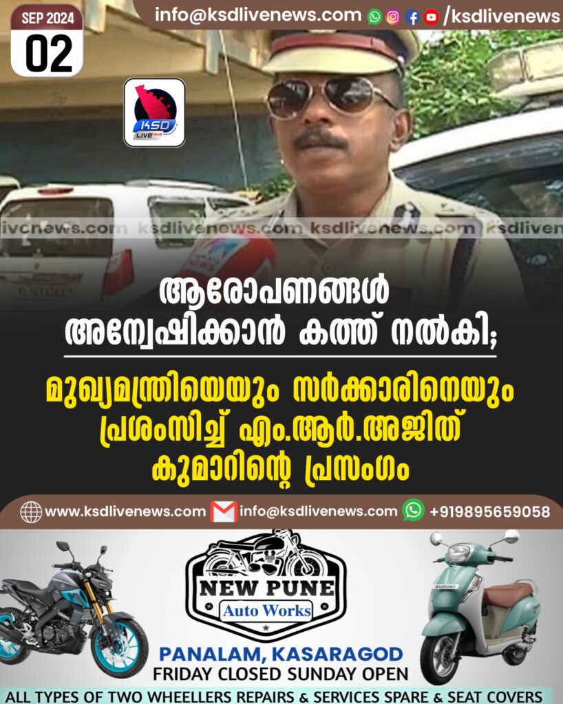 ആരോപണങ്ങൾ അന്വേഷിക്കാൻ കത്ത് നൽകി’: മുഖ്യമന്ത്രിയെയും സർക്കാരിനെയും പ്രശംസിച്ച് എം.ആർ.അജിത്കുമാറിന്റെ പ്രസംഗം