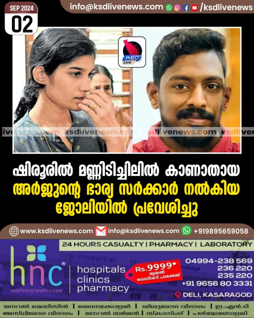 ഷിരൂരില്‍ മണ്ണിടിച്ചിലില്‍ കാണാതായ അര്‍ജുന്റെ ഭാര്യ സര്‍ക്കാര്‍ നല്‍കിയ ജോലിയില്‍ പ്രവേശിച്ചു