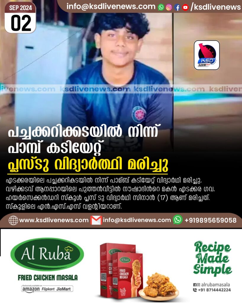 പച്ചക്കറിക്കടയില് നിന്ന് പാമ്പ് കടിയേറ്റ് പ്ലസ്ടു വിദ്യാർത്ഥി മരിച്ചു