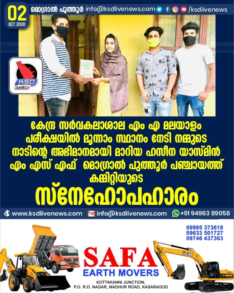 കേന്ദ്ര സർവകലാശാല എം എ മലയാളം പരീക്ഷയിൽ മൂന്നാം റാങ്ക് നേടി നമ്മുടെ നാടിന്റെ അഭിമാനമായി മാറിയ ഹസീന യാസ്മിൻ എം എസ് എഫ് മൊഗ്രാൽ പുത്തൂർ പഞ്ചായത്ത് കമ്മിറ്റിയുടെ സ്നേഹോപഹാരം എം എസ് എഫ് മൊഗ്രാൽ പുത്തൂർ പഞ്ചായത്ത് ജന.സെക്രട്ടറി ഹംറാസ് എരിയാൽ കൈമാറി, മൊഗ്രാൽ പുത്തൂർ പഞ്ചായത്ത്‌ എം എസ് എഫ് വൈസ് പ്രസിഡന്റ് അസ്ഫർ മജൽ, ജോയിന്റ് സെക്രട്ടറി സാദത്ത് എരിയാൽ എന്നിവർ സംബന്ധിച്ചു