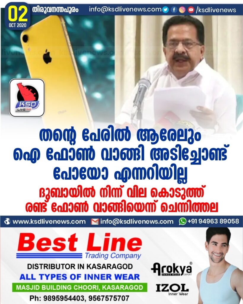 തന്റെ പേരിൽ ആരേലും ഐ ഫോൺ വാങ്ങി അടിച്ചോണ്ട് പോയോ എന്നറിയില്ല , ദുബായിൽ നിന്ന് വില കൊടുത്ത് രണ്ട് ഫോൺ വാങ്ങിയെന്ന് ചെന്നിത്തല