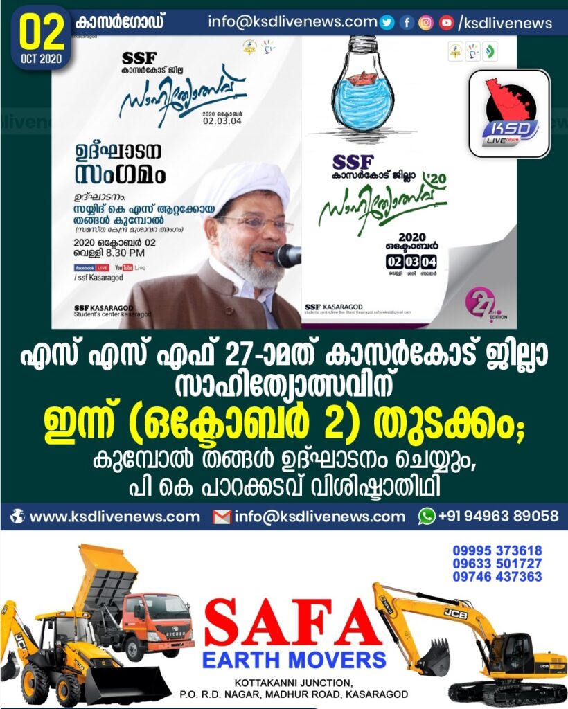 എസ് എസ് എഫ് 27 മത് കാസർകോട് ജില്ലാ സാഹിത്യോത്സവിന് ഇന്ന് (Oct 2) തുടക്കമാകും.