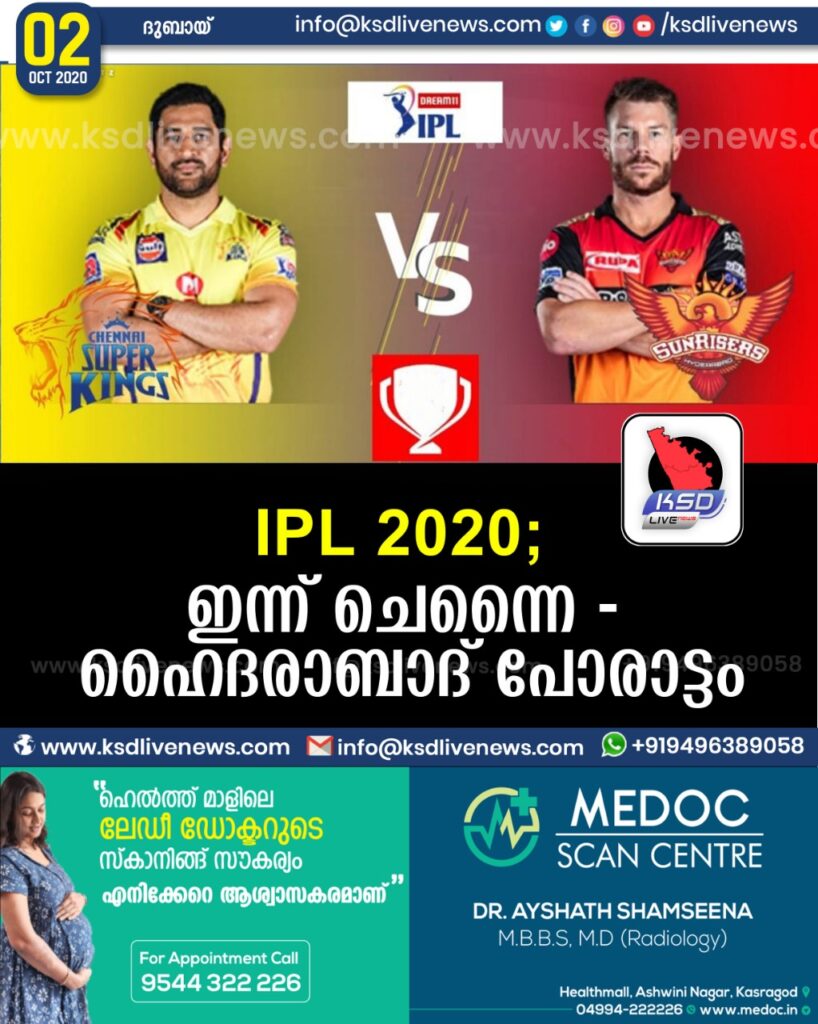 IPL2020 : ഇന്ന് ചെന്നൈ – ഹൈദരാബാദ് പോരാട്ടം