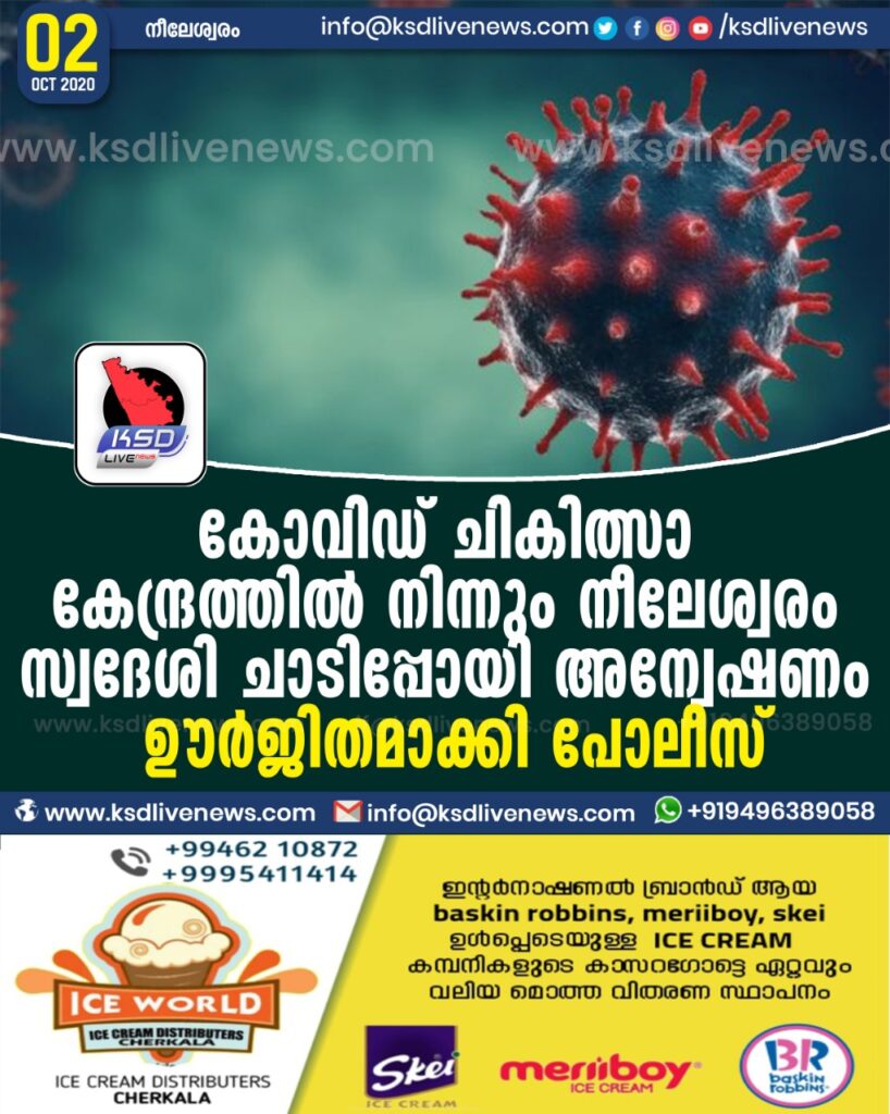 കോവിഡ് ചികിത്സാ കേന്ദ്രത്തിൽ നിന്നും നീലേശ്വരം സ്വദേശി ചാടിപ്പോയി അന്വേഷണം ഊർജിതമാക്കി പോലീസ്