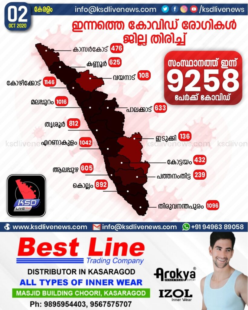 സംസ്ഥാനത്ത് ഇന്ന് 9258 പേര്ക്ക് കോവിഡ്-19 സ്ഥിരീകരിച്ചു. കോഴിക്കോട് 1146, തിരുവനന്തപുരം 1096, എറണാകുളം 1042, മലപ്പുറം 1016, കൊല്ലം 892, തൃശൂര് 812, പാലക്കാട് 633, കണ്ണൂര് 625, ആലപ്പുഴ 605, കാസര്ഗോഡ് 476, കോട്ടയം 432, പത്തനംതിട്ട 239, ഇടുക്കി 136, വയനാട് 108 എന്നിങ്ങനേയാണ് ജില്ലകളില് ഇന്ന് രോഗ ബാധ സ്ഥിരീകരിച്ചത്.