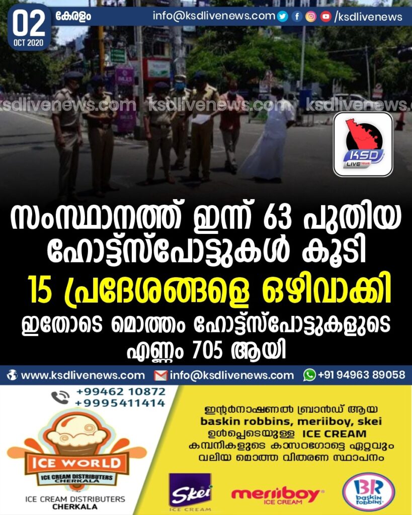 ഇന്ന് 63 പുതിയ ഹോട്ട് സ്പോട്ടുകളാണുള്ളത്. 15 പ്രദേശങ്ങളെ ഹോട്ട് സ്പോട്ടില് നിന്നും ഒഴിവാക്കിയിട്ടുണ്ട്. ഇതോടെ ആകെ 705 ഹോട്ട് സ്പോട്ടുകളാണുള്ളത്SHARE THIS ONഇന്ന് 63 പുതിയ ഹോട്ട് സ്പോട്ടുകളാണുള്ളത്. 15 പ്രദേശങ്ങളെ ഹോട്ട് സ്പോട്ടില് നിന്നും ഒഴിവാക്കിയിട്ടുണ്ട്. ഇതോടെ ആകെ 705 ഹോട്ട് സ്പോട്ടുകളാണുള്ളത്