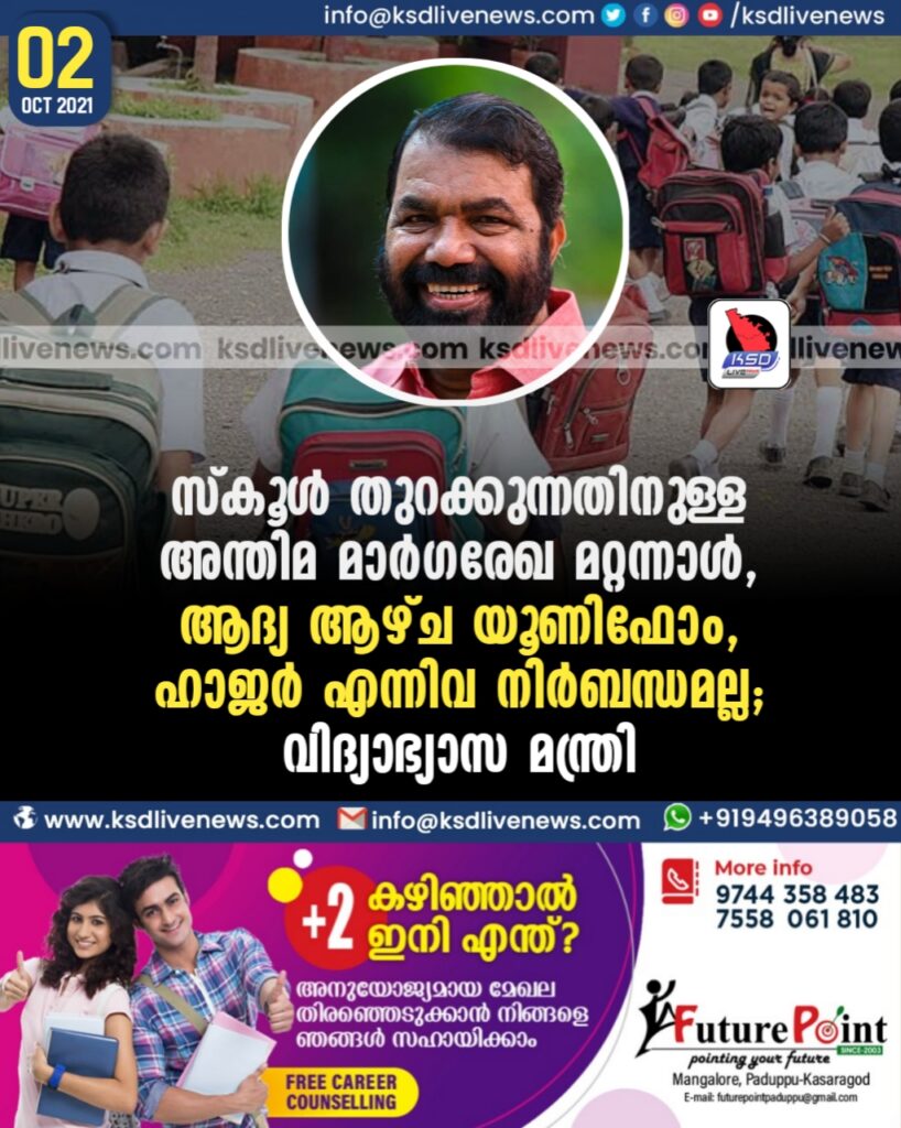 സ്കൂൾ തുറക്കുന്നതിനുള്ള അന്തിമ മാര്ഗരേഖ മറ്റന്നാള്, ആദ്യ ആഴ്ച യൂണിഫോം, ഹാജര് എന്നിവ നിര്ബന്ധമല്ല ; വിദ്യാഭ്യാസ മന്ത്രി
