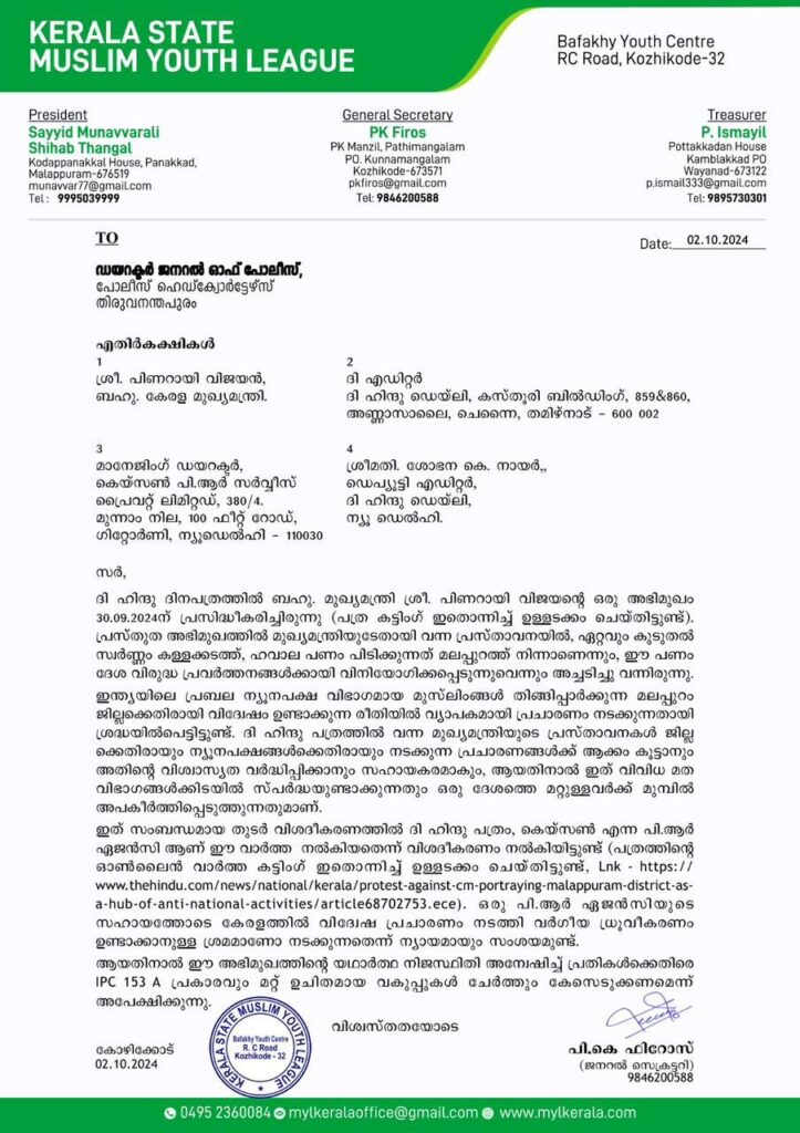കെയ്സൺ പിആർ ഏജൻസിയാണ് വാർത്ത നൽകിയതെന്നാണ് ദി ഹിന്ദു പത്രം നൽകുന്ന വിശദീകരണം. പിആർ ഏജൻസിയുടെ സഹായത്തോടെ കേരളത്തിൽ വിദ്വേഷ പ്രചാരണം നടത്തി ധ്രുവീകരണം നടത്താനുള്ള ശ്രമമാണോ നടക്കുന്നതെന്ന് സംശയമുണ്ട്. അഭിമുഖത്തിന്റെ നിജസ്ഥിതി അന്വേഷിച്ച് പ്രതികൾക്കെതിരെ 153 എ അടക്കമുള്ള വകുപ്പുകൾ ചേർത്ത് കേസെടുക്കണമെന്ന് യൂത്ത് ലീഗ് ജനറൽ സെക്രട്ടറി പി.കെ ഫിറോസ് നൽകിയ പരാതിയിൽ പറയുന്നു.