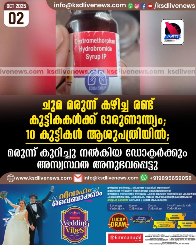 ചുമ മരുന്ന് കഴിച്ച രണ്ട് കുട്ടികകൾക്ക് ദാരുണാന്ത്യം: 10 കുട്ടികൾ ആശുപത്രിയിൽ; മരുന്ന് കുറിച്ചു നൽകിയ ഡോക്ടർക്കുംഅസ്വസ്ഥത അനുഭവപ്പെട്ടു