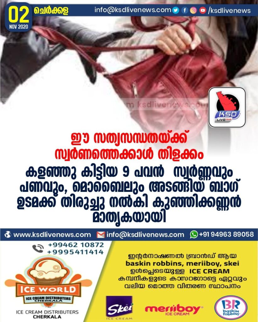 കളഞ്ഞു കിട്ടിയ 9 പവൻ സ്വർണ്ണവും പണവും, മൊബൈലും അടങ്ങിയ ബാഗ് ഉടമക്ക് തിരുച്ചു നൽകി കുഞ്ഞിക്കണ്ണൻ മാതൃകയായി