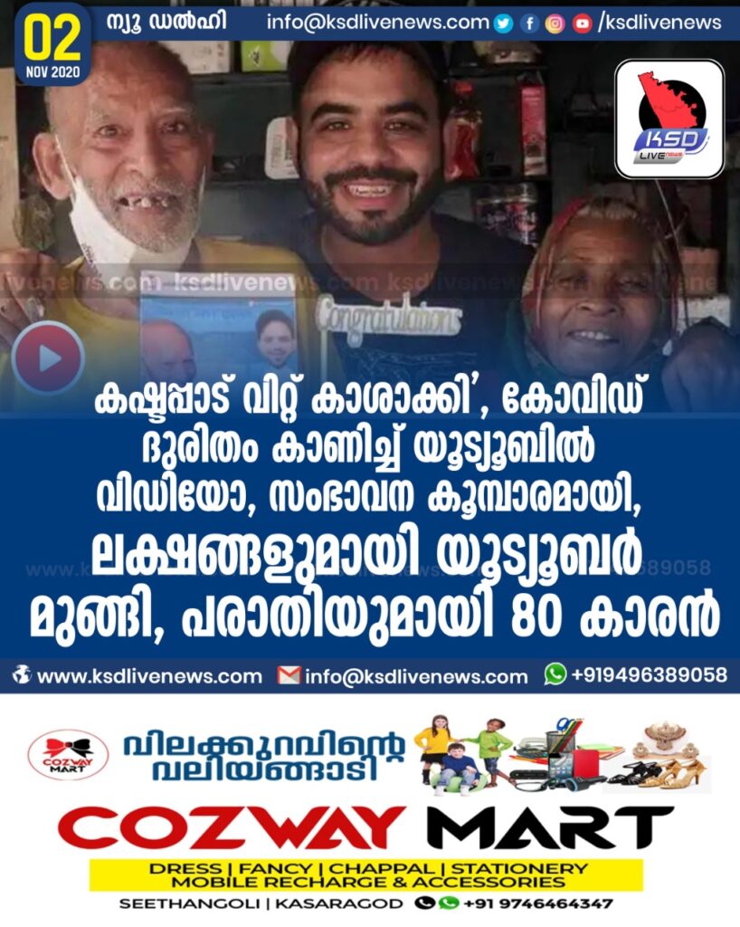കഷ്ടപ്പാട് വിറ്റ് കാശാക്കി ‘ , കോവിഡ് ദുരിതം കാണിച്ച് യൂട്യൂബിൽ വിഡിയോ , സംഭാവന കൂമ്ബാരമായി , ലക്ഷങ്ങളുമായി യൂട്യൂബർ മുങ്ങി , പരാതിയുമായി 80 കാരൻ
