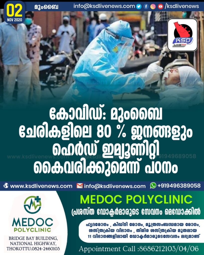 കോവിഡ്: മുംബൈ ചേരികളിലെ 80 % ജനങ്ങളും ഹെര്ഡ് ഇമ്യൂണിറ്റി കൈവരിക്കുമെന്ന് പഠനം
