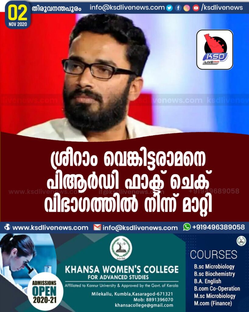 ശ്രീറാം വെങ്കിട്ടരാമനെ പിആർഡി ഫാക്ട് ചെക് വിഭാഗത്തിൽ നിന്ന് മാറ്റി