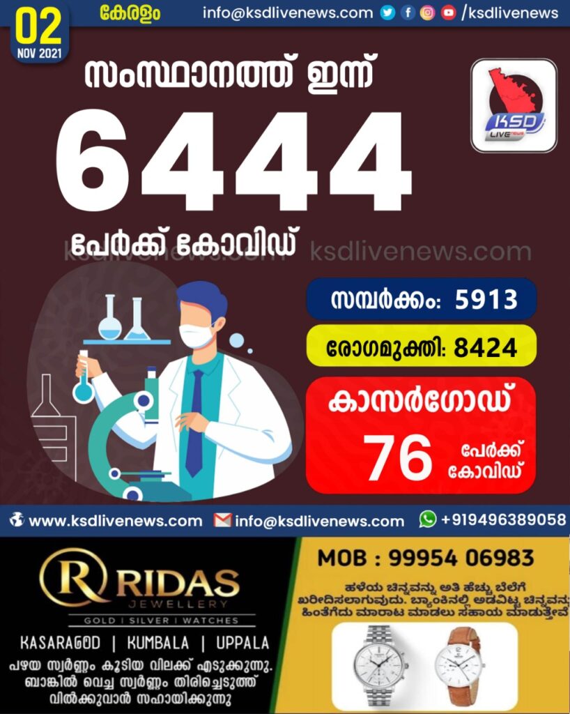 സംസ്ഥാനത്ത് ഇന്ന് 6444 പേർക്ക് കോവിഡ് സ്ഥിരീകരിച്ചു. സമ്പർക്കം വഴി 5913 പേർക്കും ; ആശ്വാസമായി 8424 പേർക്ക് രോഗ മുക്തിയും ; കാസർഗോഡ് ജില്ലയിൽ 76 പേർക്ക് പുതിയ കോവിഡ് കേസുകൾ ; മരണം 45