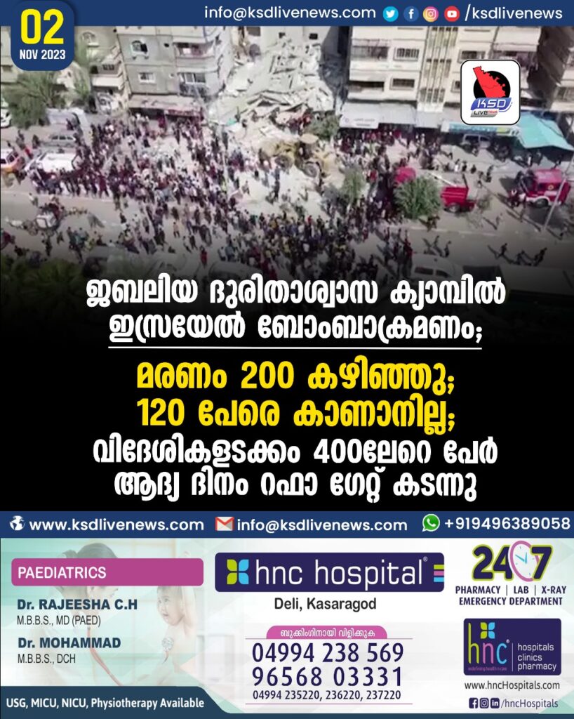 ജബലിയ ദുരിതാശ്വാസ ക്യാമ്പിൽ ഇസ്രയേൽ ബോംബാക്രമണം; മരണം 200 കഴിഞ്ഞു; 120 പേരെ കാണാനില്ല; വിദേശികളടക്കം 400ലേറെ പേർ ആദ്യ ദിനം റഫാ ഗേറ്റ് കടന്നു