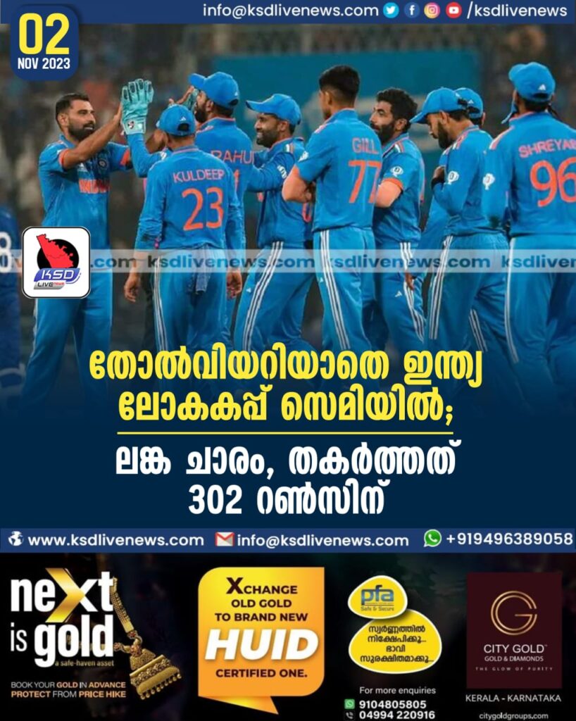 തോല്വിയറിയാതെ ഇന്ത്യ ലോകകപ്പ് സെമിയില്; ലങ്ക ചാരം, തകര്ത്തത് 302 റണ്സിന്