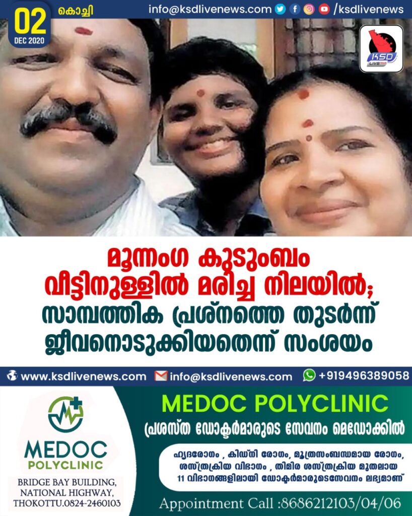 മൂന്നംഗ കുടുംബം വീട്ടിനുള്ളിൽ മരിച്ച നിലയിൽ ; സാമ്പത്തിക പ്രശ്നത്തെ തുടർന്ന് ജീവനൊടുക്കിയതെന്ന് സംശയം