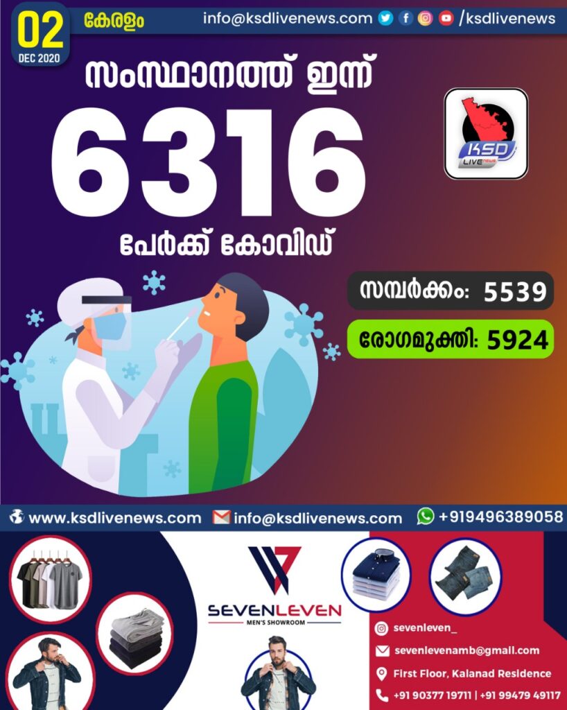 സംസ്ഥാനത്ത് ഇന്ന് 6316 പേർക്ക് കോവിഡ് സ്ഥിരീകരിച്ചു. സമ്പർക്കം വഴി 5539 പേർക്കും ; ആശ്വാസമായി 5924 പേർക്ക് രോഗ മുക്തിയും ; മരണം 28