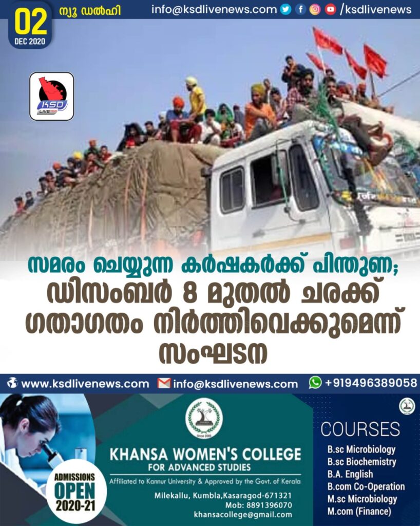 സമരം ചെയ്യുന്ന കർഷകർക്ക് പിന്തുണ; ഡിസംബർ 8 മുതൽ ചരക്ക് ഗതാഗതം നിർത്തിവെക്കുമെന്ന് സംഘടന