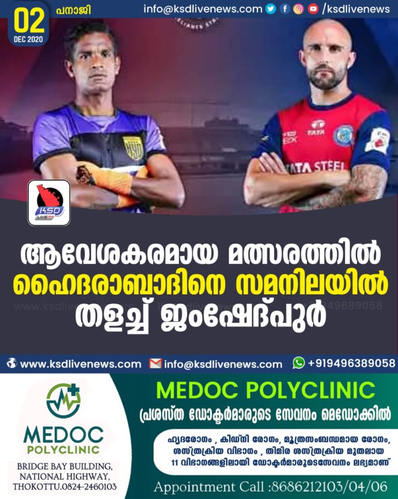 ആവേശകരമായ മത്സരത്തിൽ ഹൈദരാബാദിനെ സമനിലയിൽ തളച്ച് ജംഷേദ്പുർ