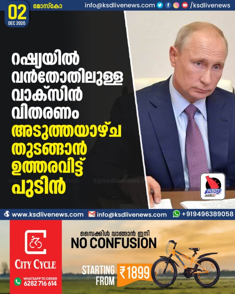 റഷ്യയില്‍ വന്‍തോതിലുള്ള വാക്‌സിന്‍ വിതരണം അടുത്തയാഴ്ച തുടങ്ങാന്‍ ഉത്തരവിട്ട് പുതിന്‍