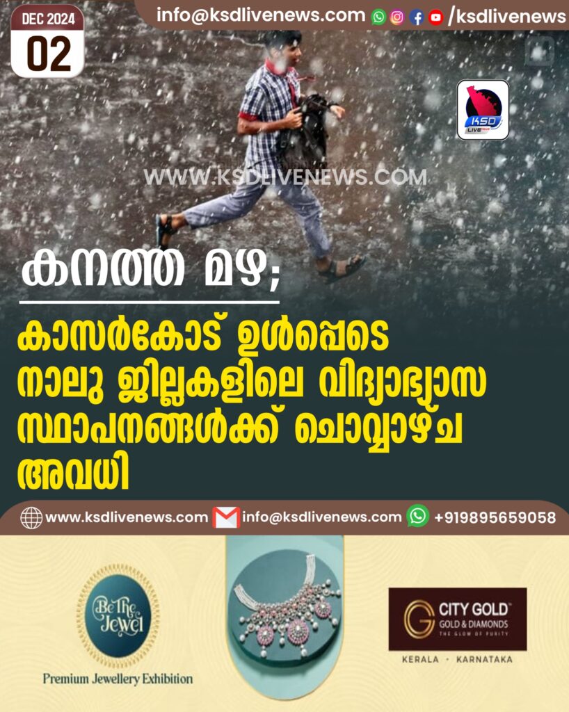 കനത്ത മഴ; കാസർകോട് ഉൾപ്പെടെ നാലു ജില്ലകളിലെ വിദ്യാഭ്യാസ സ്ഥാപനങ്ങള്ക്ക് ചൊവ്വാഴ്ച അവധി