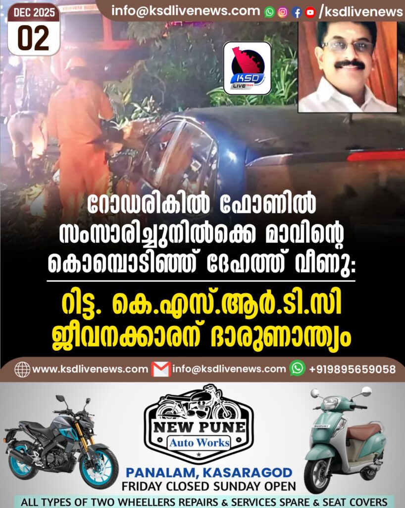 റോഡരികിൽ ഫോണിൽ സംസാരിച്ചുനിൽക്കെ മാവിന്റെ കൊമ്പൊടിഞ്ഞ് ദേഹത്ത് വീണു: റിട്ട. കെ.എസ്.ആർ.ടി.സി ജീവനക്കാരന് ദാരുണാന്ത്യം