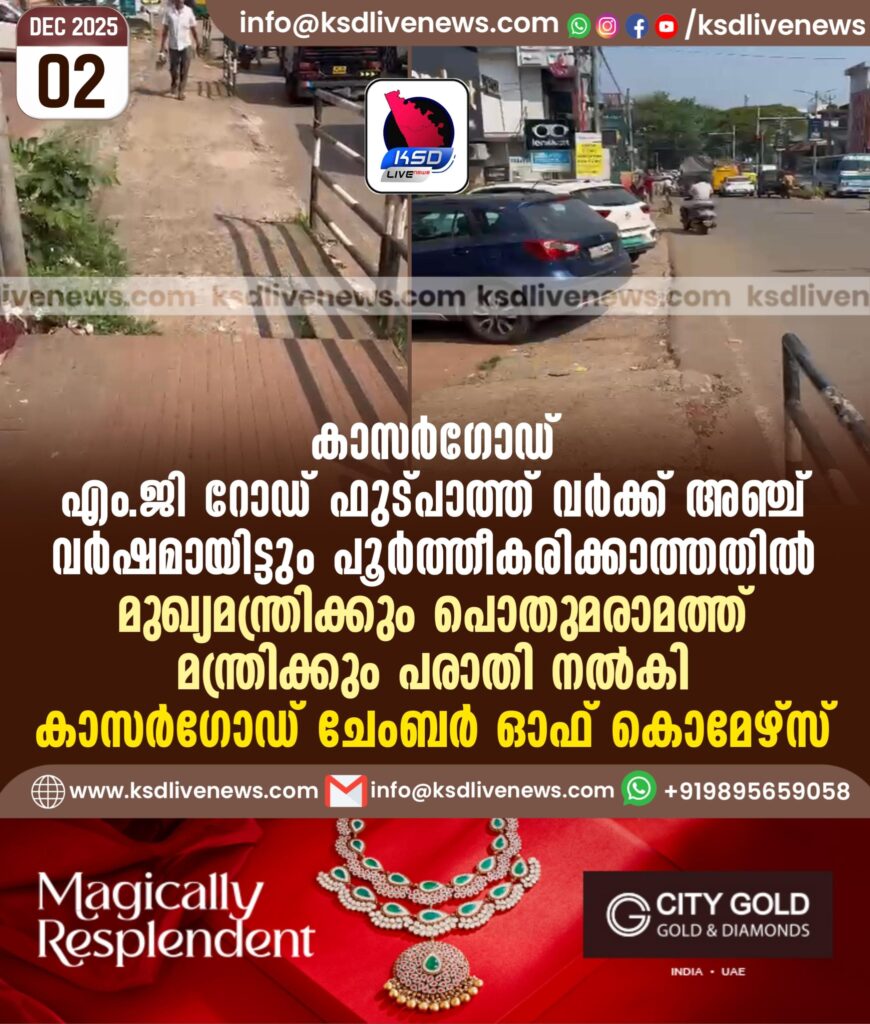 കാസർഗോഡ് എംജി റോഡ് ഫുട്പാത്ത് വർക്ക് അഞ്ച് വർഷമായിട്ടും പൂർത്തീകരിക്കാത്തതിൽ മുഖ്യമന്ത്രിക്കും പൊതുമരാമത്ത് മന്ത്രിക്കും പരാതി നൽകി കാസർഗോഡ് ചേംബർ ഓഫ് കൊമേഴ്സ്