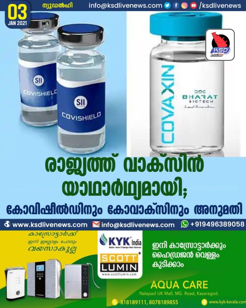 രാജ്യത്ത് വാക്സിൻ യാഥാർഥ്യമായി ; കോവിഷീൽഡിനും കോവാക്സിനും അനുമതി