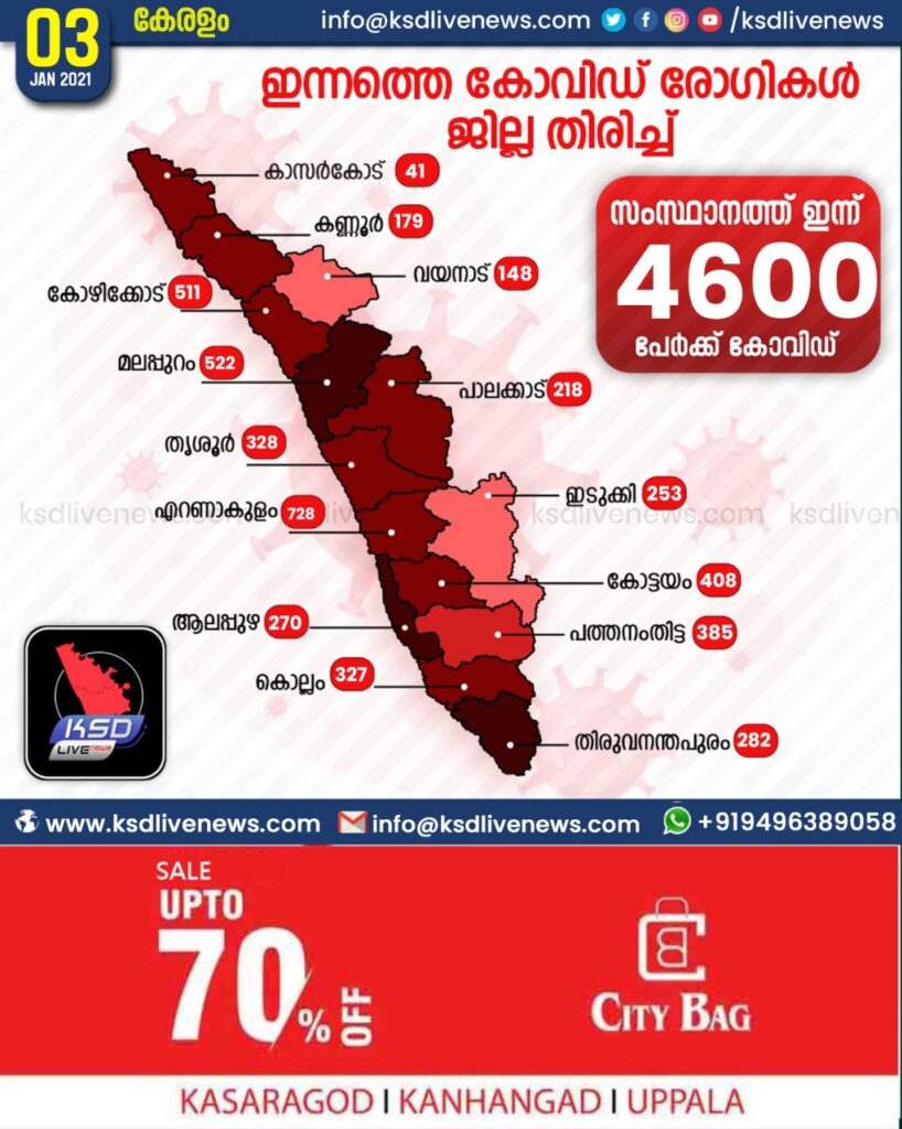 സംസ്ഥാനത്ത് ഇന്ന് 4600 പേര്‍ക്ക് കോവിഡ്-19 സ്ഥിരീകരിച്ചു. എറണാകുളം 728, മലപ്പുറം 522, കോഴിക്കോട് 511, കോട്ടയം 408, പത്തനംതിട്ട 385, തൃശൂര്‍ 328, കൊല്ലം 327, തിരുവനന്തപുരം 282, ആലപ്പുഴ 270, ഇടുക്കി 253, പാലക്കാട് 218, കണ്ണൂര്‍ 179, വയനാട് 148, കാസര്‍ഗോഡ് 41 എന്നിങ്ങനേയാണ് ജില്ലകളില്‍ ഇന്ന് രോഗ ബാധ സ്ഥിരീകരിച്ചത്.