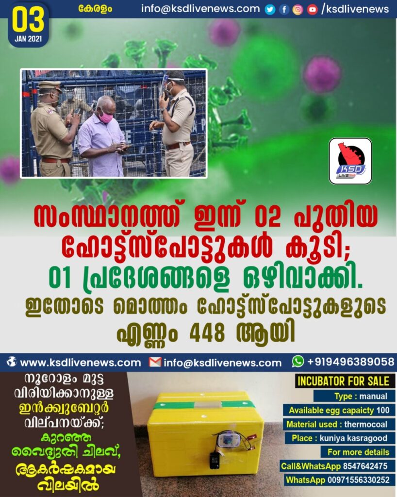സംസ്ഥാനത്ത് ഇന്ന് 02 പുതിയ ഹോട്ട്സ്പോട്ടുകള് കൂടി; 01 പ്രദേശങ്ങളെ ഒഴിവാക്കി. ഇതോടെ മൊത്തം ഹോട്ട്സ്പോട്ടുകളുടെ എണ്ണം 448 ആയി.