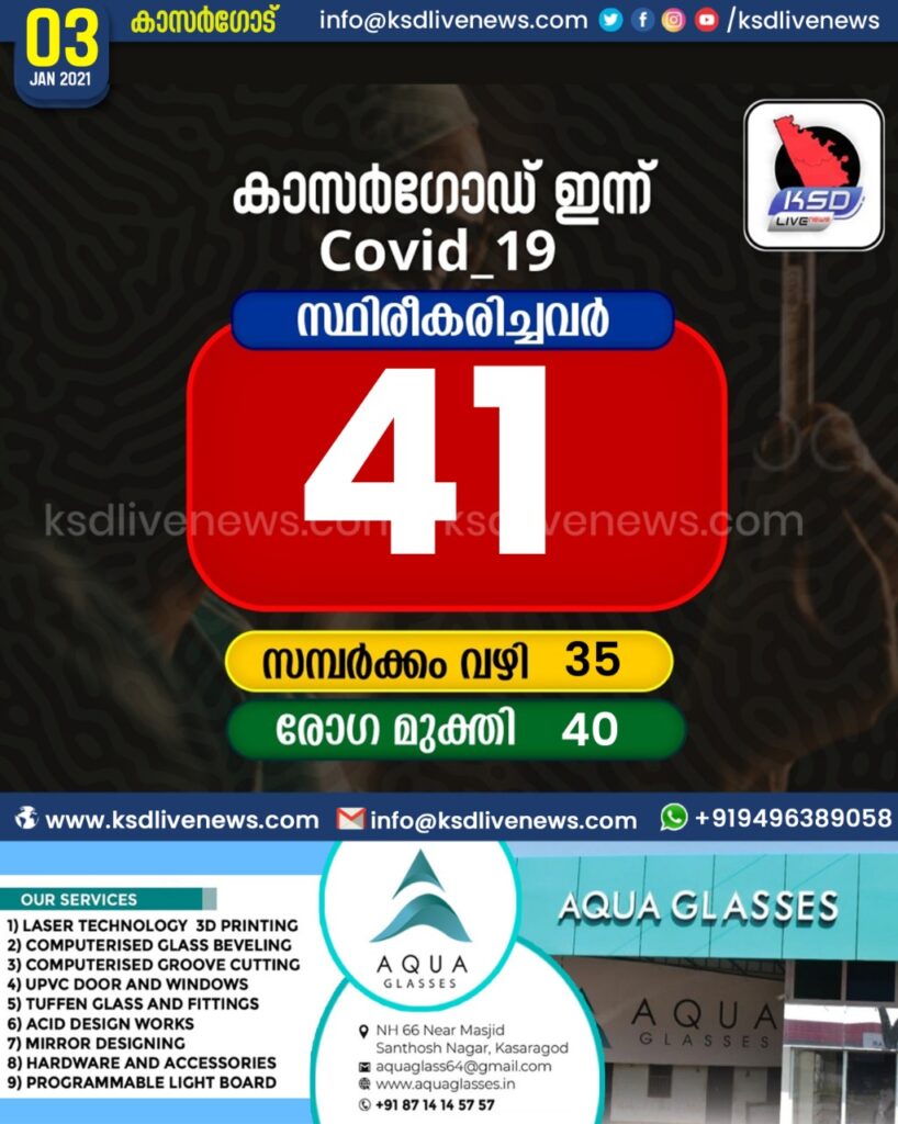 കാസർഗോഡ് ജില്ലയിൽ ഇന്ന് 41 പേർക്ക് കോവിഡ് സ്ഥിരീകരിച്ചു. സമ്പർക്കം വഴി 35 പേർക്കും. 40 പേർക്ക് രോഗമുക്തി