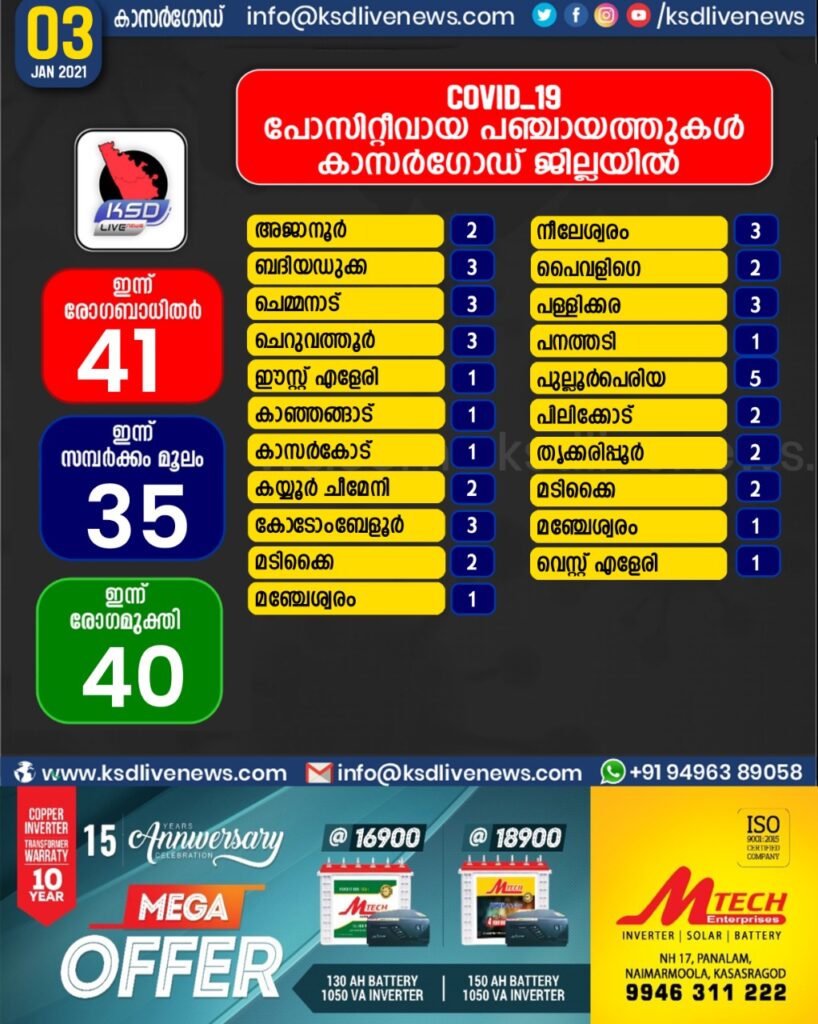 കാസർഗോഡ് ജില്ലയിൽ ഇന്ന് കോവിഡ് സ്ഥിരീകരിച്ചവരുടെ പഞ്ചായത്ത് തിരിച്ചുള്ള സ്ഥിതി വിവര കണക്ക്