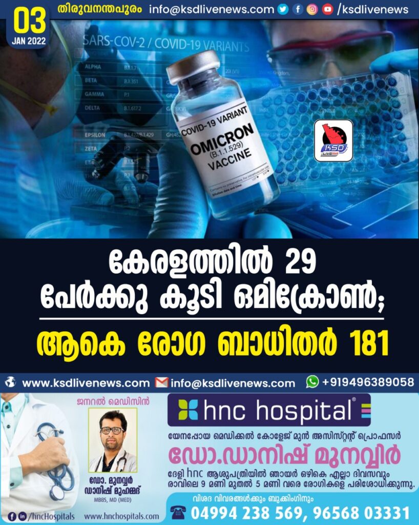 കേരളത്തിൽ 29 പേർക്കു കൂടി ഒമിക്രോൺ; ആകെ രോഗ ബാധിതർ 181