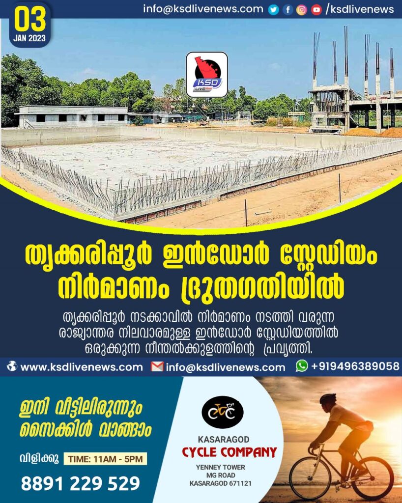 തൃക്കരിപ്പൂർ ∙ ജില്ലയ്ക്ക് അനുവദിച്ച രാജ്യാന്തര നിലവാരത്തിലുള്ള ഇൻഡോർ സ്റ്റേഡിയത്തിന്റെ നിർമാണം തൃക്കരിപ്പൂരിലെ നടക്കാവിൽ പുരോഗമിക്കുന്നു. നീന്തൽ കുളം നിർമാണമാണ് ഇപ്പോൾ നടക്കുന്നത്. ഇതിന്റെ പ്രവൃത്തി അന്തിമഘട്ടത്തിലെത്തിയെന്നു ബന്ധപ്പെട്ടവർ വിശദീകരിച്ചു. നീന്തലിൽ രാജ്യാന്തര തലത്തിൽ മത്സരങ്ങൾ നടത്താവുന്ന വിധമാണ് ഒരുക്കുന്നത്. നീന്തൽ പഠിക്കുന്നതിനും വാട്ടർ പോളോ, കനോയ് പോളോ, അണ്ടർവാട്ടർ ഹോക്കി, അണ്ടർവാട്ടർ റഗ്ബി, ഫിൻസ്, സ്‌പോർട്‌സ് ഡൈവിങ് തുടങ്ങിയ അണ്ടർവാട്ടർ സ്‌പോർട്‌സുകൾക്കും ജീവൻ രക്ഷാ പ്രവർത്തനങ്ങൾക്കുള്ള പരിശീലനവും ഇവിടെ നടക്കും. ജില്ലയിലെ ആദ്യത്തെ സെമി ഒളിംപിക് നീന്തൽ കുളമാണ് തൃക്കരിപ്പൂരിൽ ഒരുങ്ങുന്നത്.