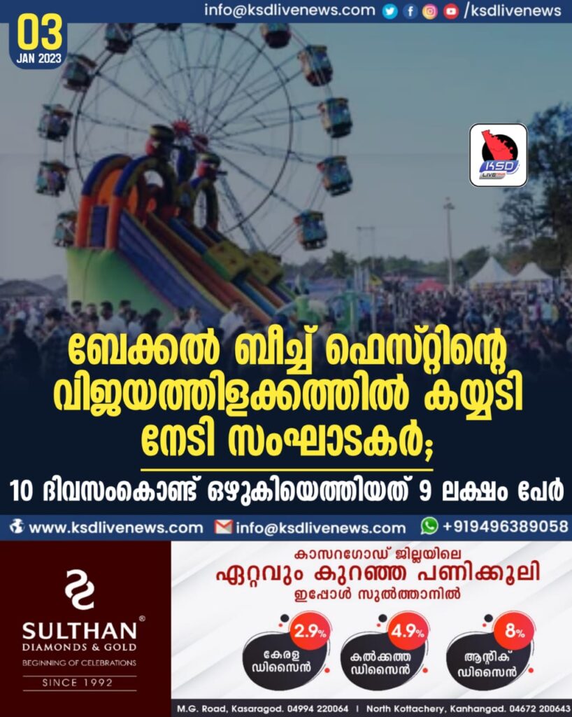 ബേക്കല് ബീച്ച് ഫെസ്റ്റിന്റെ വിജയത്തിളക്കത്തില് കയ്യടി നേടി സംഘാടകര്; 10 ദിവസംകൊണ്ട് ഒഴുകിയെത്തിയത് 9 ലക്ഷം പേര്