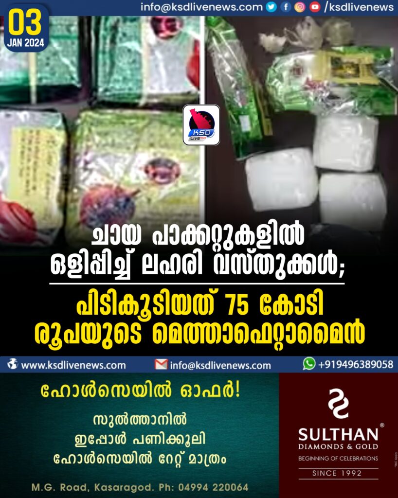 ചായ പാക്കറ്റുകളിൽ ഒളിപ്പിച്ച് ലഹരി വസ്തുക്കൾ; പിടികൂടിയത് 75 കോടി രൂപയുടെ മെത്താഫെറ്റാമൈൻ
