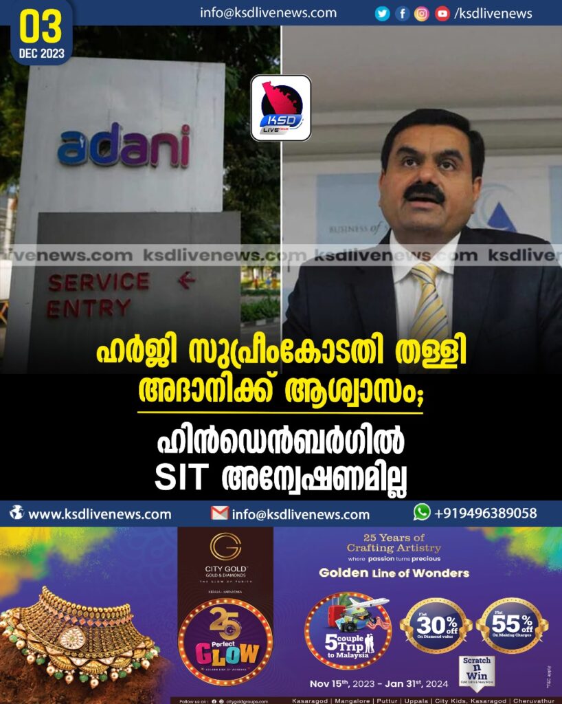 ഹര്ജി സുപ്രീംകോടതി തള്ളി, അദാനിക്ക് ആശ്വാസം; ഹിന്ഡെന്ബര്ഗില് SIT അന്വേഷണമില്ല