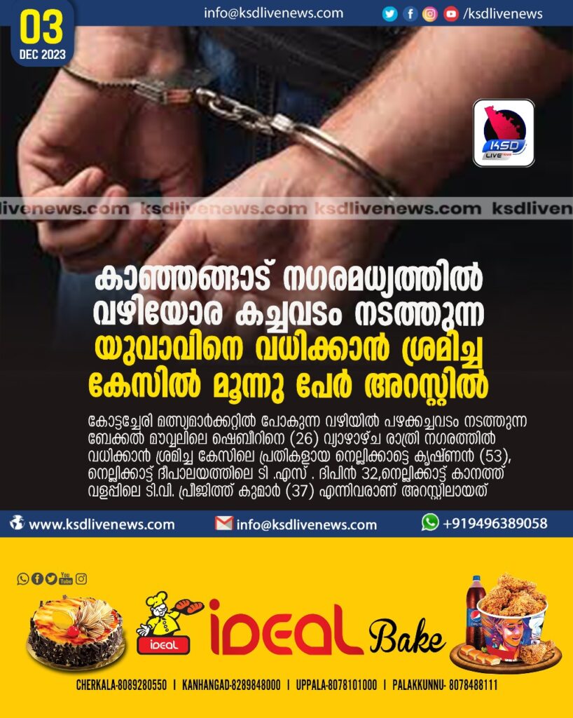 കാഞ്ഞങ്ങാട് നഗരമധ്യത്തിൽ വഴിയോര കച്ചവടം നടത്തുന്ന യുവാവിനെ വധിക്കാൻ ശ്രമിച്ച കേസിൽ മൂന്നു പേർ അറസ്റ്റിൽ