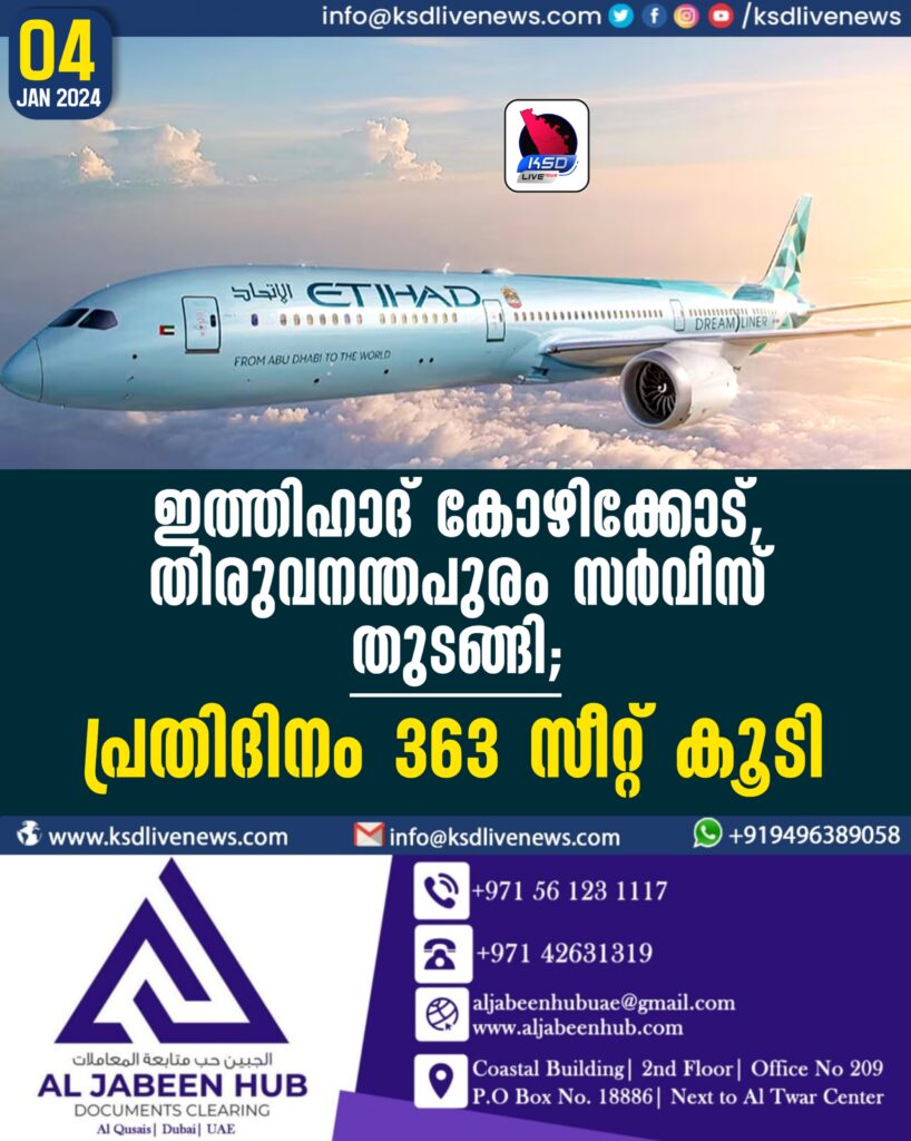 ഇത്തിഹാദ് കോഴിക്കോട്, തിരുവനന്തപുരം സർവീസ് തുടങ്ങി; പ്രതിദിനം 363 സീറ്റ് കൂടി