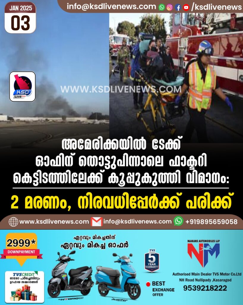 അമേരിക്കയിൽ ടേക്ക് ഓഫിന് തൊട്ടുപിന്നാലെ ഫാക്ടറി കെട്ടിടത്തിലേക്ക് കൂപ്പുകുത്തി വിമാനം, 2 മരണം, നിരവധിപ്പേർക്ക് പരിക്ക്