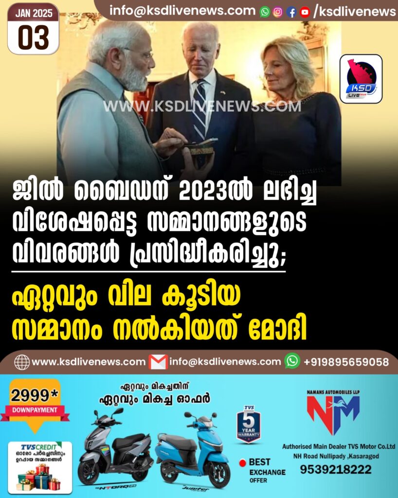 ജില്‍ ബൈഡന് 2023ല്‍ ലഭിച്ച വിശേഷപ്പെട്ട സമ്മാനങ്ങളുടെ വിവരങ്ങള്‍ പ്രസിദ്ധീകരിച്ചു; ഏറ്റവും വില കൂടിയ സമ്മാനം നല്‍കിയത് മോദി