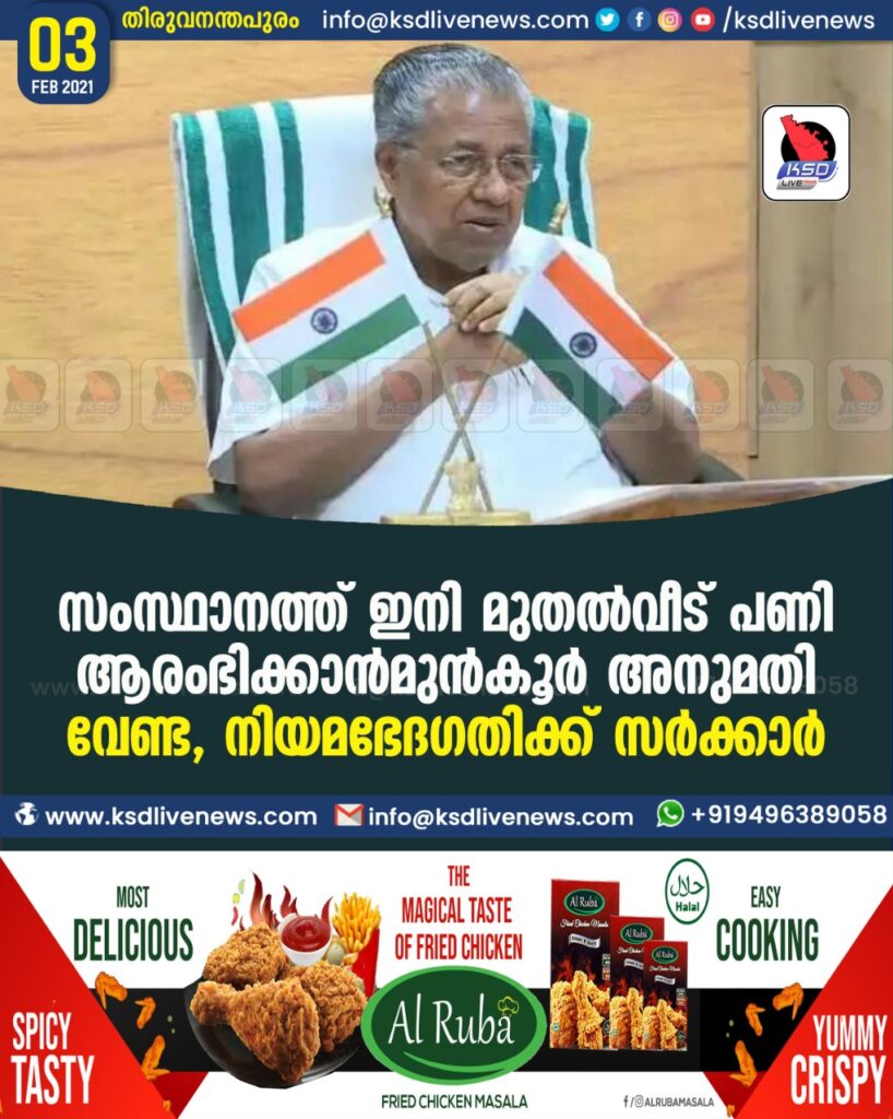 സംസ്ഥാനത്ത് ഇനി മുതൽ വീട് പണി ആരംഭിക്കാൻ മുൻകൂർ അനുമതി വേണ്ട , നിയമഭേദഗതിക്ക് സർക്കാർ