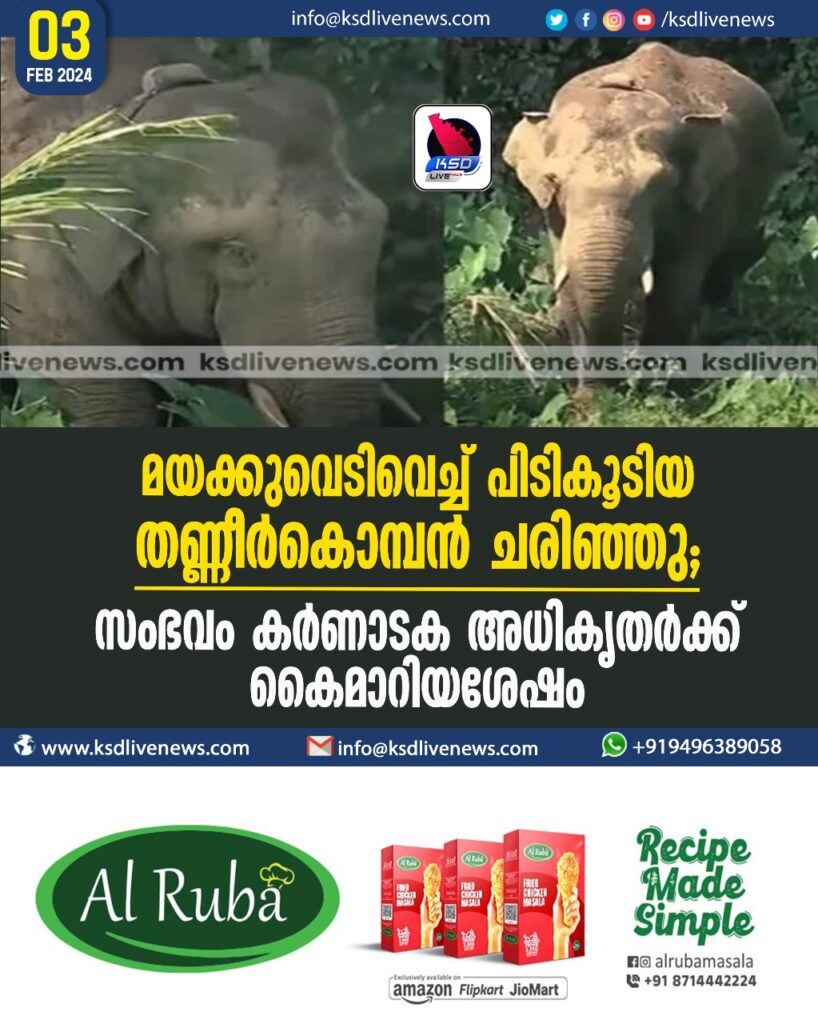 മയക്കുവെടിവെച്ച് പിടികൂടിയ തണ്ണീർകൊമ്പൻ ചരിഞ്ഞു; സംഭവം കർണാടക അധികൃതർക്ക് കൈമാറിയശേഷം