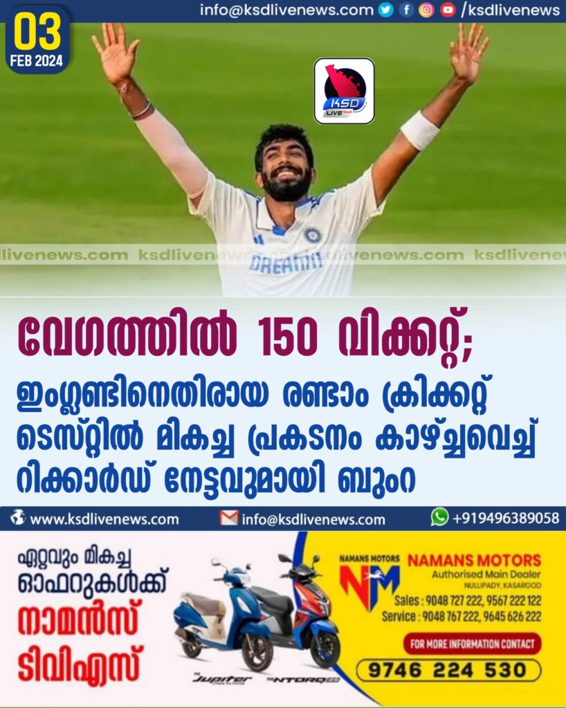 വേഗത്തില് 150 വിക്കറ്റ്;ഇംഗ്ലണ്ടിനെതിരായ രണ്ടാം ക്രിക്കറ്റ് ടെസ്റ്റില് മികച്ച പ്രകടനം കാഴ്ച്ചവെച്ച്റിക്കാര്ഡ് നേട്ടവുമായി ബുംറ