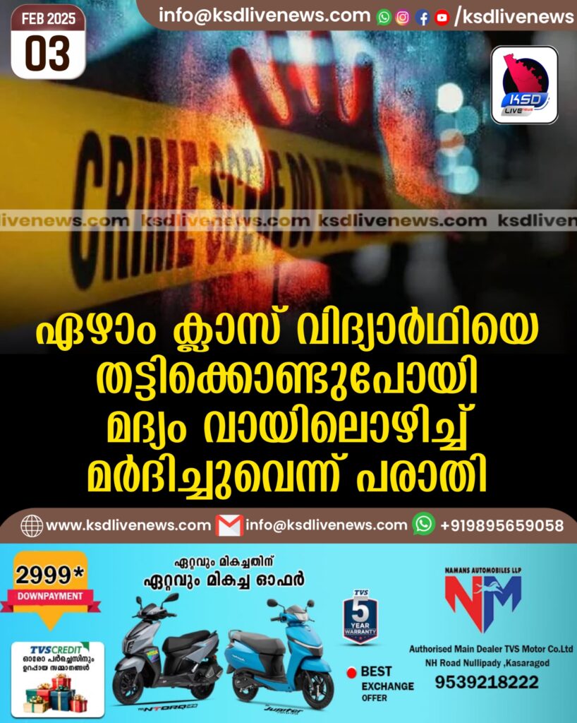 ഏഴാം ക്ലാസ് വിദ്യാര്ഥിയെ തട്ടിക്കൊണ്ടുപോയി മദ്യം വായിലൊഴിച്ച് മര്ദിച്ചുവെന്ന് പരാതി