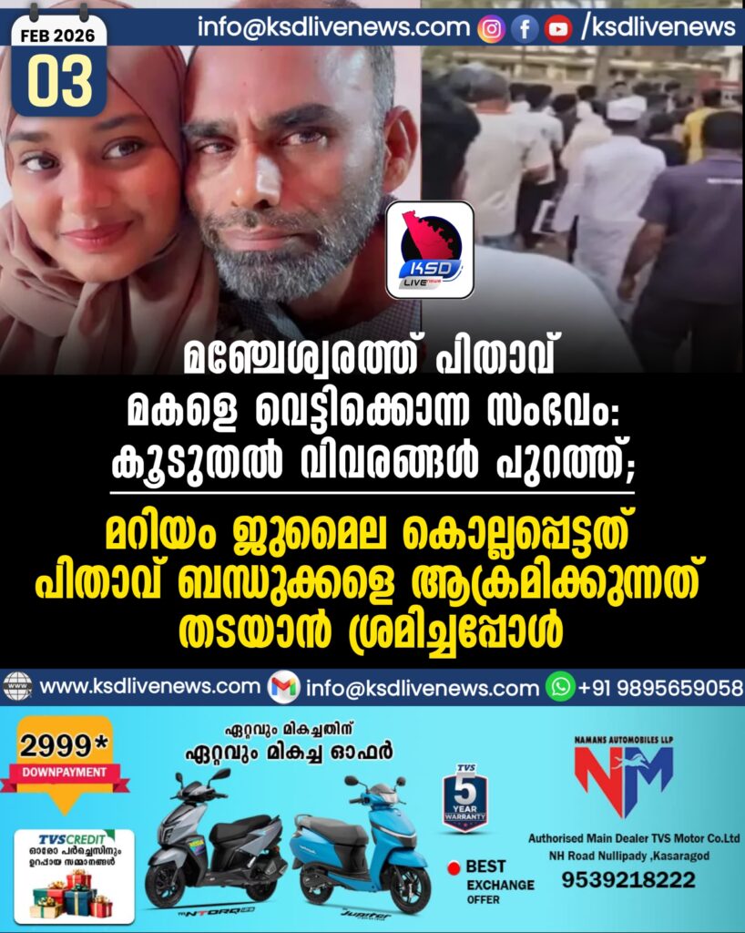 മഞ്ചേശ്വരത്ത് പിതാവ് മകളെ വെട്ടിക്കൊന്ന സംഭവം: കൂടുതൽ വിവരങ്ങൾ പുറത്ത്; മറിയം ജുമൈല കൊല്ലപ്പെട്ടത് പിതാവ് ബന്ധുക്കളെ ആക്രമിക്കുന്നത് തടയാൻ ശ്രമിച്ചപ്പോൾ