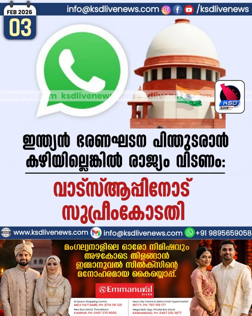 ഇന്ത്യൻ ഭരണഘടന പിന്തുടരാൻ കഴിയില്ലെങ്കിൽ രാജ്യം വിടണം: വാട്സ്ആപ്പിനോട് സുപ്രീംകോടതി