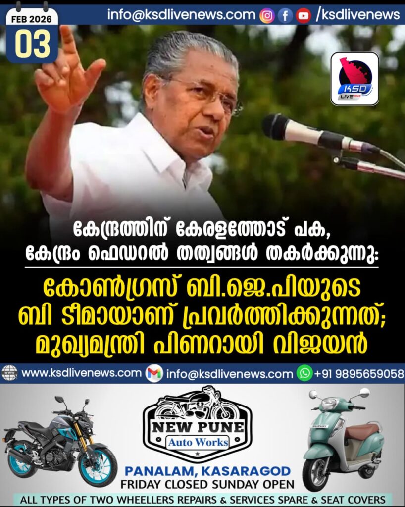കേന്ദ്രത്തിന് കേരളത്തോട് പക, കേന്ദ്രം ഫെഡറല്‍ തത്വങ്ങള്‍ തകര്‍ക്കുന്നു: കോണ്‍ഗ്രസ് ബിജെപിയുടെ ബി ടീമായാണ് പ്രവര്‍ത്തിക്കുന്നത്; മുഖ്യമന്ത്രി പിണറായി വിജയൻ