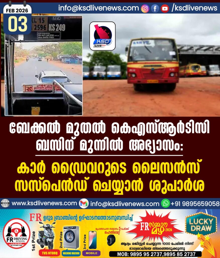 ബേക്കൽ മുതൽ കെഎസ്ആർടിസി ബസിന് മുന്നിൽ അഭ്യാസം; കാർ ഡ്രൈവറുടെ ലൈസൻസ് സസ്പെൻഡ് ചെയ്യാൻ ശുപാർശ